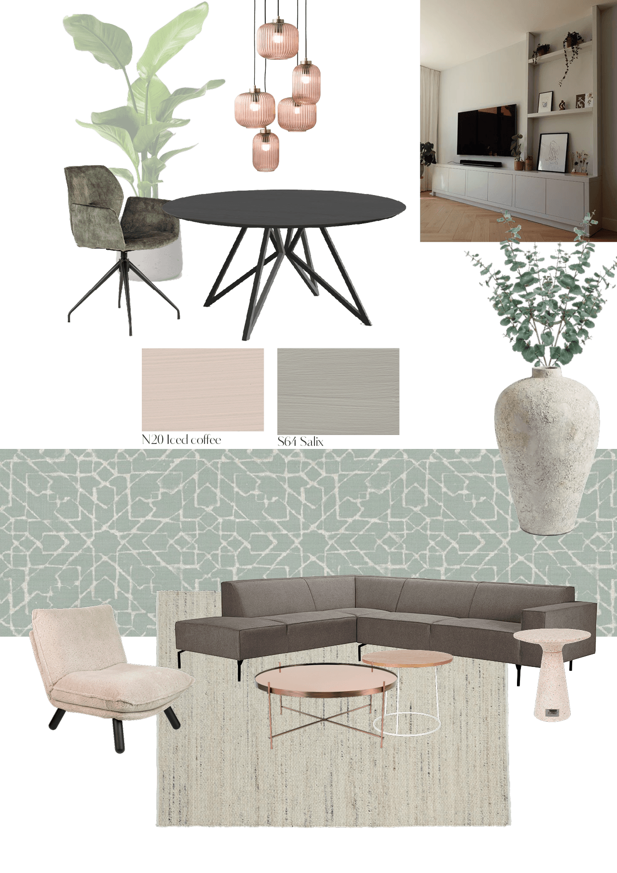 Voor dit ontwerp kreeg ik de vraag om een woonkamer in te richten, omdat de opdrachtgever hier zelf niet uit kwam. Zij gaven aan dat hun het lastig vonden om van hun stijlen een geheel te maken. Door goed te luisteren naar hun wensen en te kijken naar wat beelden die zij mij aan hadden geleverd ben ik tot een passend ontwerp gekomen. Momenteel wordt dit ontwerp nog gerealiseerd, maar de beelden hiervan zullen binnenkort te zien zijn.
